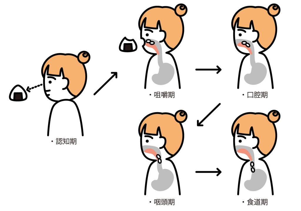 この段階では、食べ物を目で見たり、においを感じたりすることで、それが食べ物であると認識します。そして「おいしそう」「食べたい」といった意欲が生まれます。つまり、脳が中心となって食事のスタートを切る重要な段階です。この働きが低下すると、食べ物と認識できなかったり、食欲そのものが湧かなくなったりします。